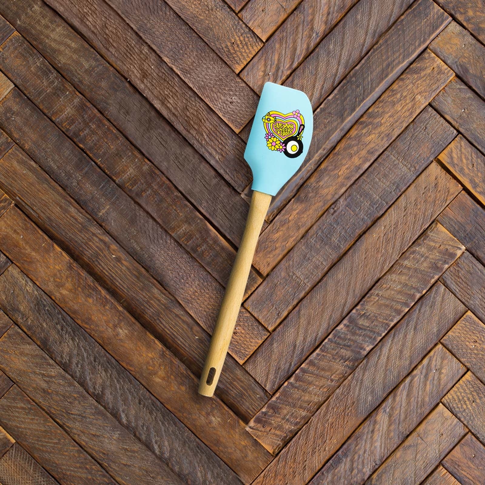 Ready to mix up some fun? This silicone spatula is perfect for scraping bowls and mixing batter. One side has a catchy saying and design, and the other side has an easy-to-read conversion chart. The removable spatula head is dishwasher safe, and the round wooden handle allows for convenient hanging storage.