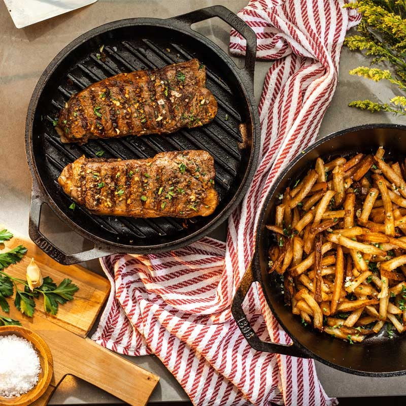 This chef-inspired dutch oven is a dream for any home chef! The smart design features a lid that doubles as a grill pan, which can work together with the dutch oven to create an entire meal. Steak frites, anyone? The naturally seasoned cast iron cooking surface provides great heat retention for all your favorites, from sourdough bread to homemade curry. That’s magic!