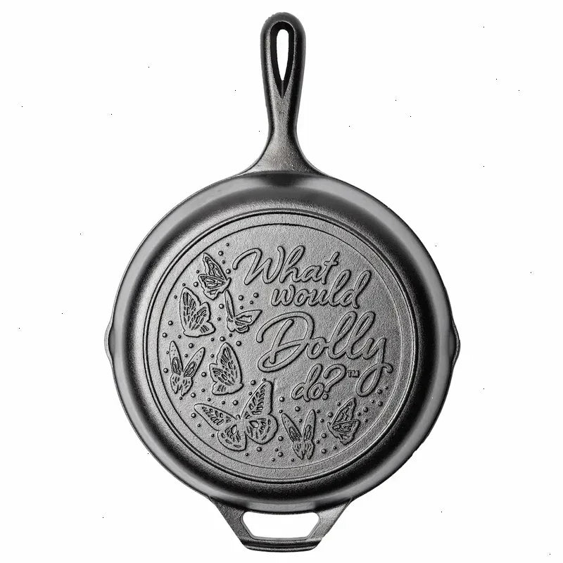 Featuring a special "What Would Dolly Do?" design, this cast iron skillet brings a bit of Dolly's wisdom to every day. The naturally seasoned cooking surface is designed to perform for generations, on any heat source. This set includes Duncan Hines® Dolly Parton's Vanilla Flavored Cake Mix and Duncan Hines® Dolly Parton's Creamy Vanilla Flavored Frosting, so you can make a fresh skillet cake at home in true Dolly fashion. Plus, it includes a stand to proudly display your cast iron. Down home quality in a delicious skillet cake? Dolly loves that idea.
