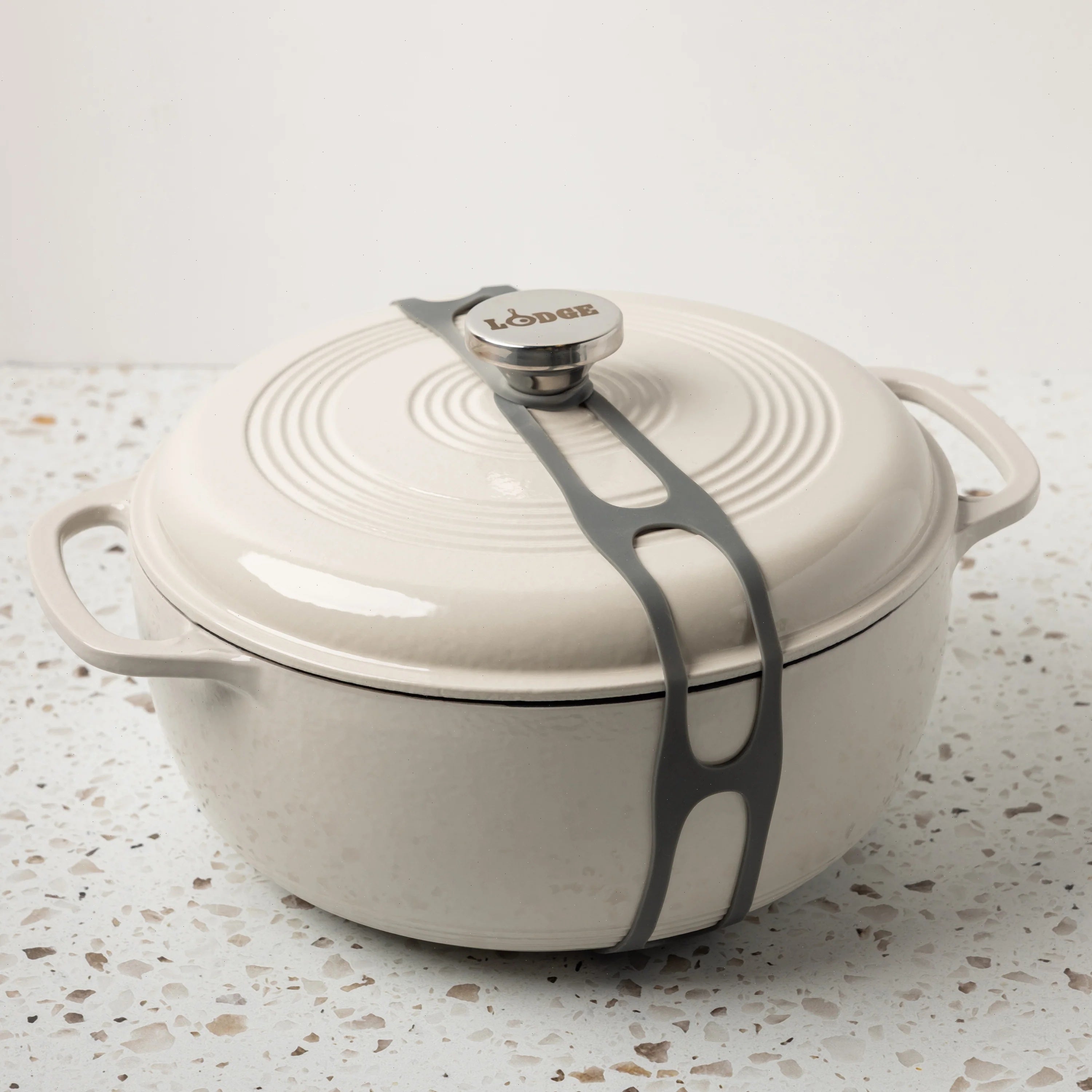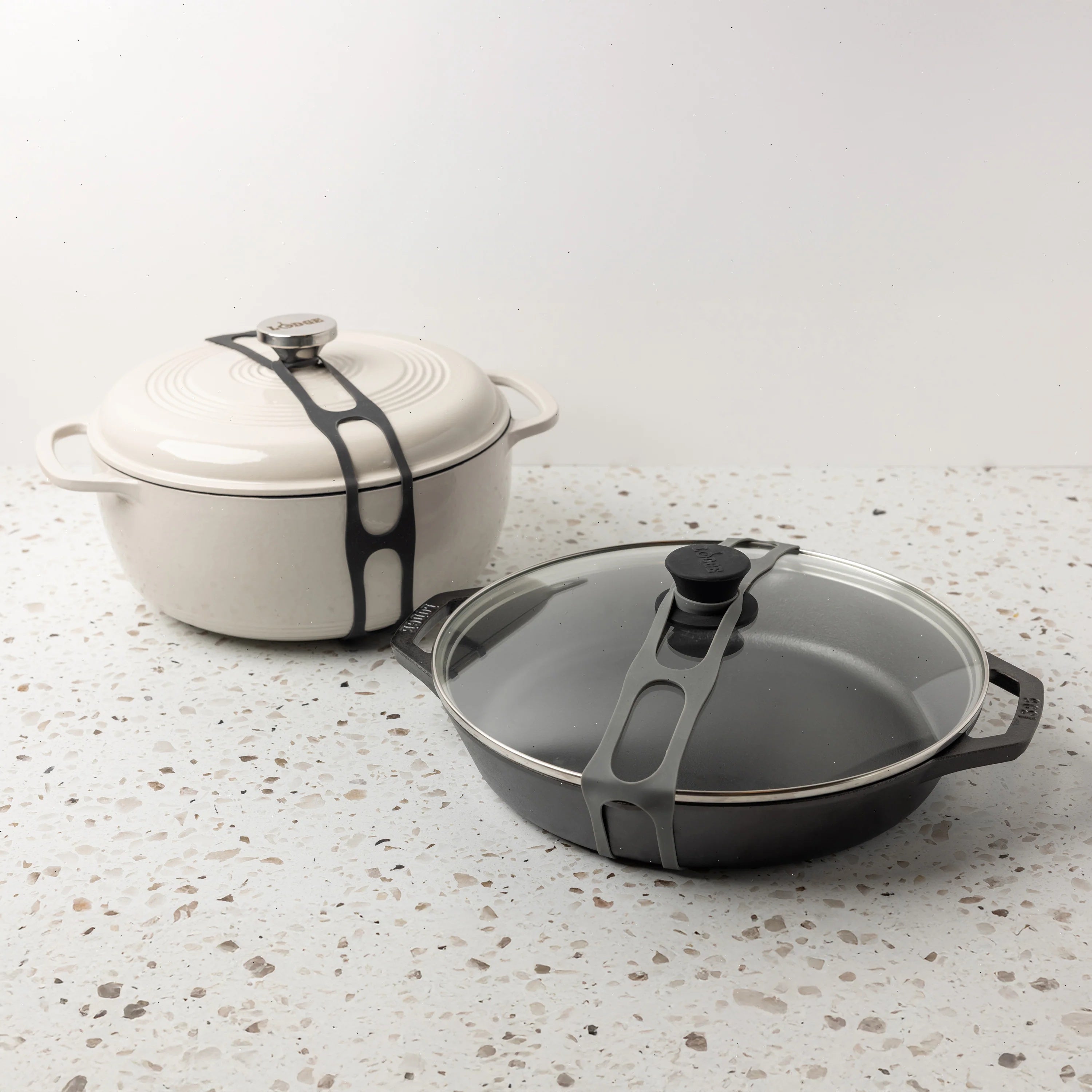Use the Lid Latch to secure lids on dutch ovens, skillets, and dual handle pans. The latches are made with stretchy, food-grade silicone that makes them compatible with almost any piece of cookware. This makes it easy to securely transport dishes without worrying about your dish spilling in the backseat of your car. Can we get a “lid, latch, love” for that?